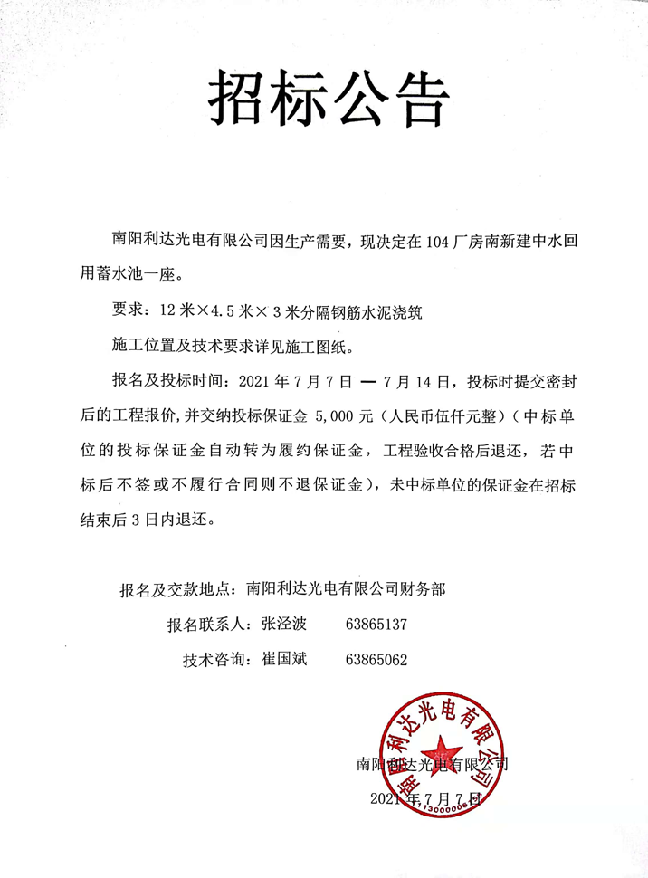 修建104廠(chǎng)房中水回用蓄水池招標