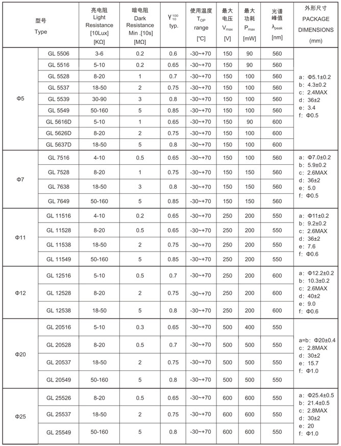 環(huán)氧樹(shù)脂封裝型光敏電阻系列1 Resin Package Photocells Series1